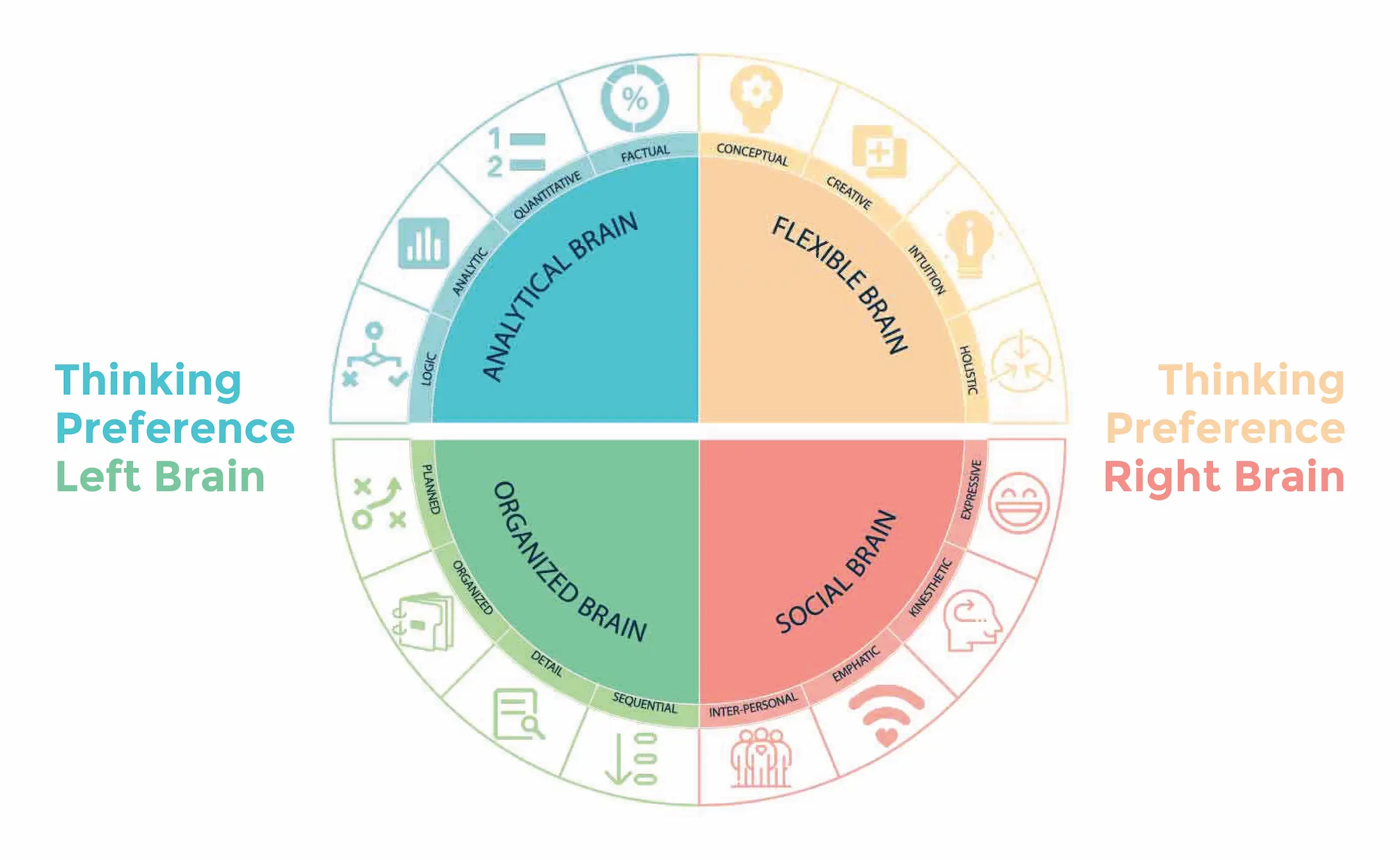- 与他人互动:偏好的思维和沟通风格会影响社交和职场互动。了解自身和他人的大脑优势可以揭示沟通和协作中潜在的协同效应或摩擦点,从而有助于促进更佳的互动。