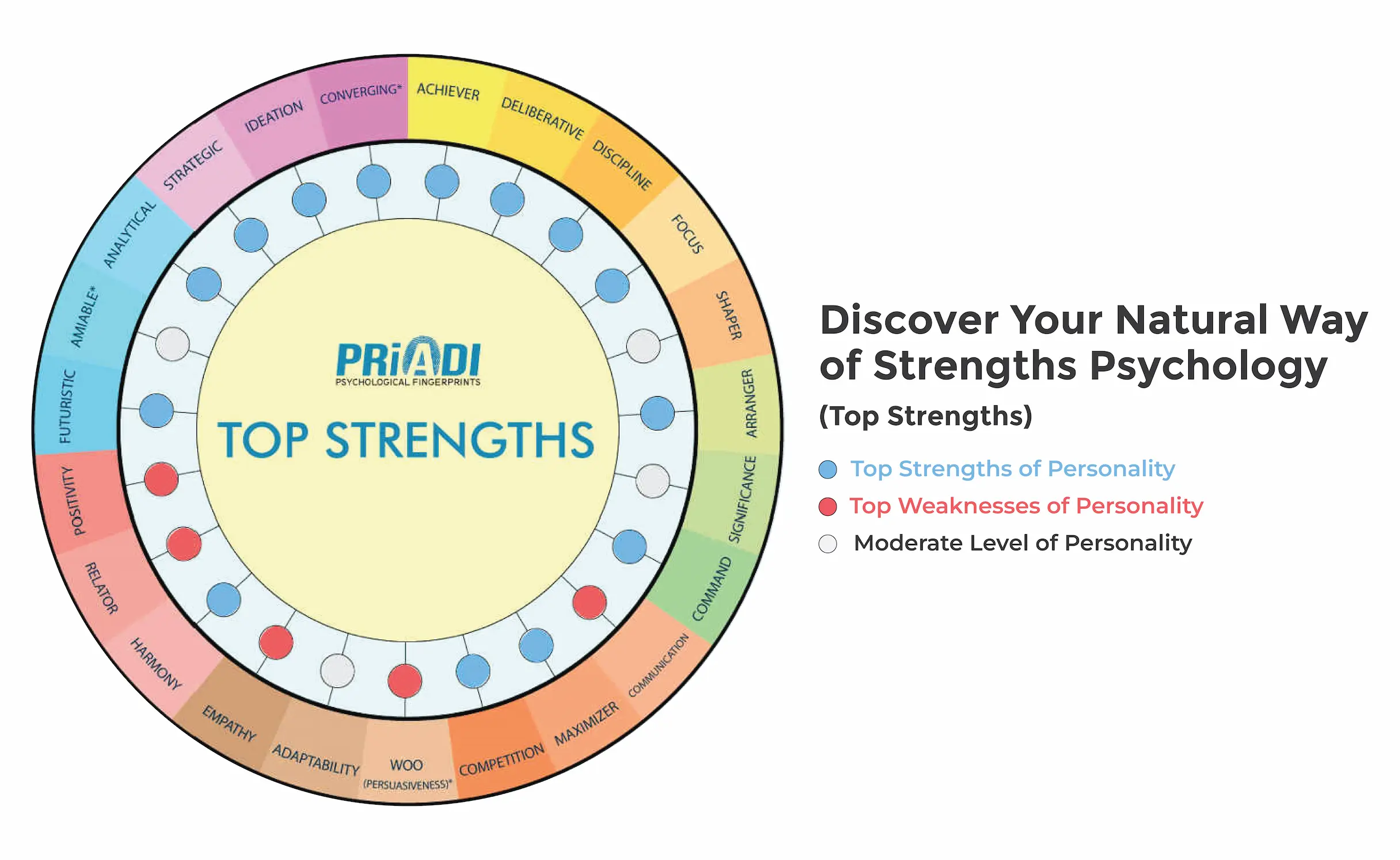 总而言之,PRiADI 心理指纹利用优势心理学(特别是克利夫顿优势 (CliftonStrengths) 所推广的主题)的语言和概念框架,提供其所主张的个人先天行为和潜在优势的概况。与自我报告评估不同,PRiADI 声称通过指纹分析来识别这些倾向,并将其呈现为与生俱来的人格基础。蓝色、红色和灰色圆点直观地代表了这些先天倾向的强度,为了解个人的天赋及其在互动和工作风格中的表现方式提供了独特的视角,最终旨在为个人成长和理解提供自我认知。